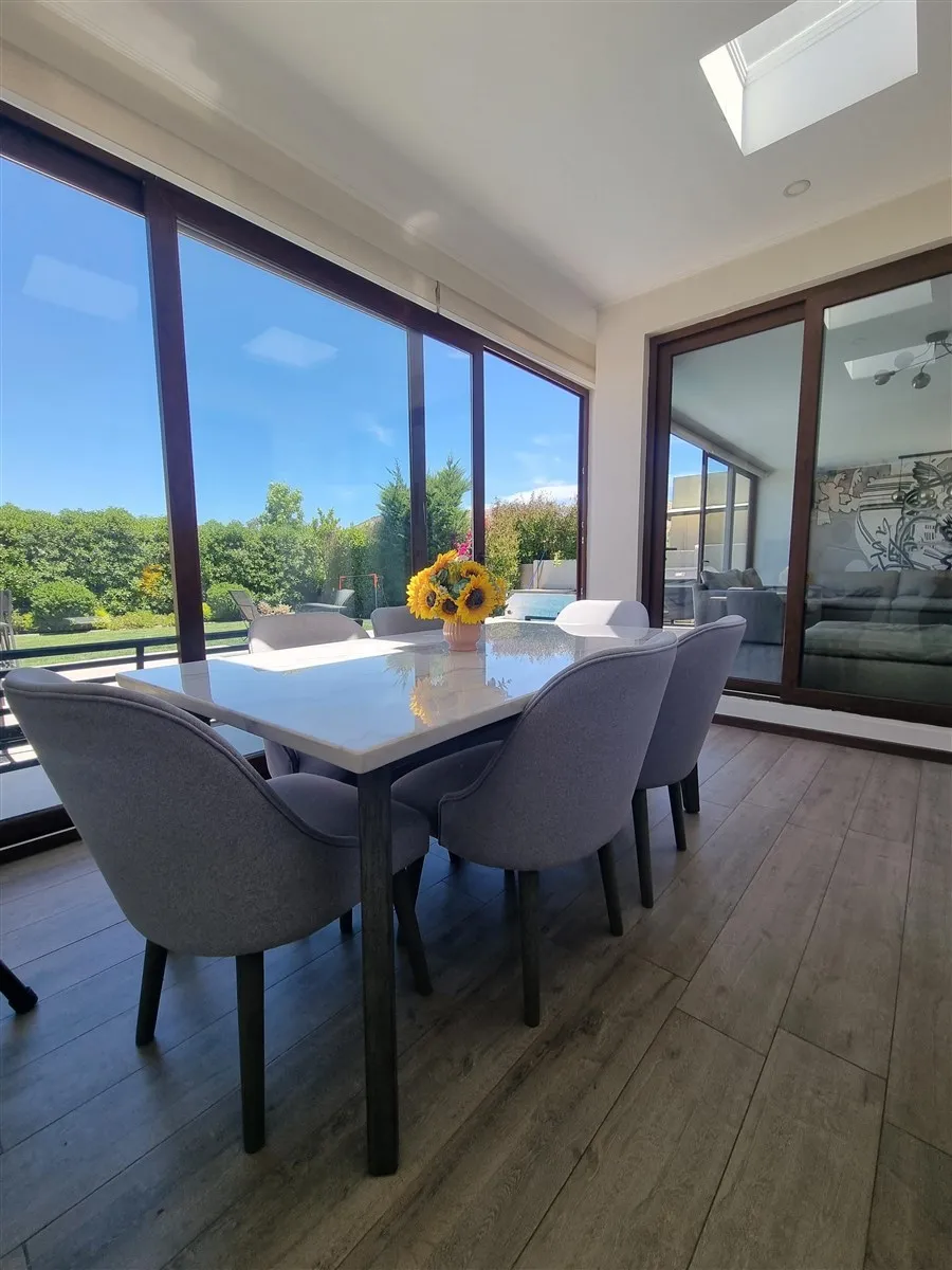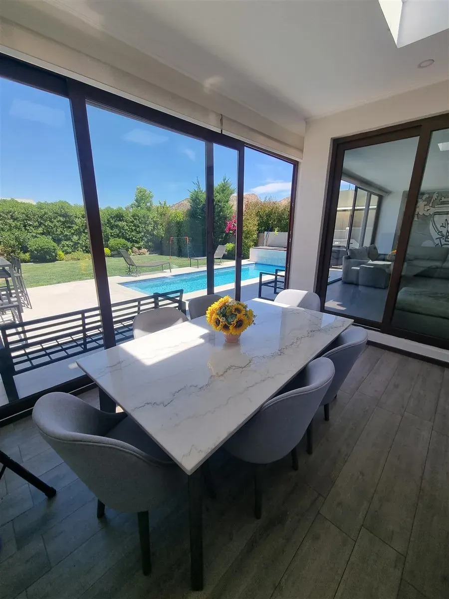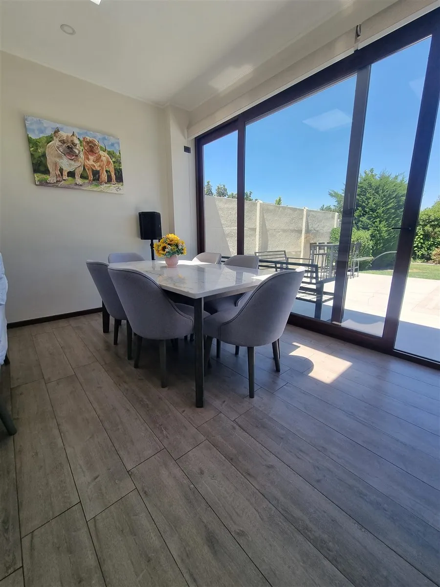 – Terraza cerrada que funciona como comedor, conectada a cocina y jardín